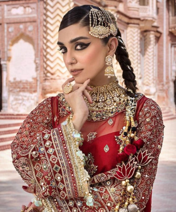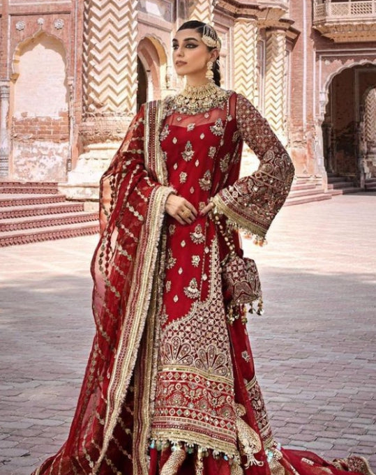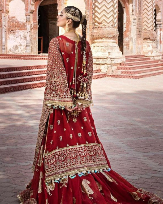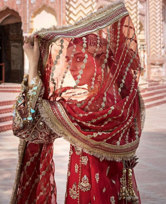 Enter the enchanting world of ‘Biya Begum,’ a traditional red bridal jora that exudes timeless allure. This captivating ensemble features an organza shirt adorned with intricate details – from embroidered dori to hand embellishment, Tilla work, sequins, and mesmerizing mirror work. The embroidered satin silk hem border adds an extra touch of opulence.Complementing this masterpiece is an embroidered organza dupatta, elegantly finished with a four-sided satin silk border, creating a harmonious balance of tradition and contemporary elegance. The gold foil print organza gharara, with its satin silk border, adds a regal flair to this stunning ensemble. ‘Biya Begum’ is the epitome of bridal splendor, designed to make you feel like royalty on your special day.