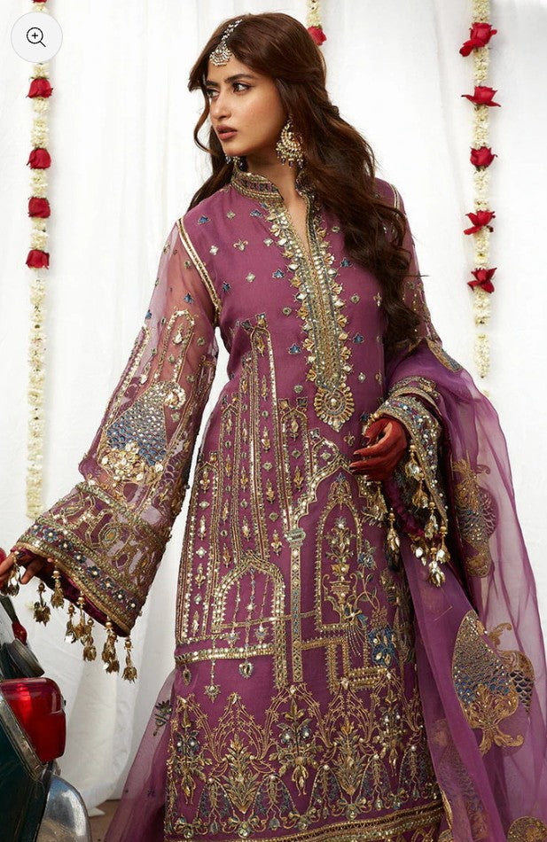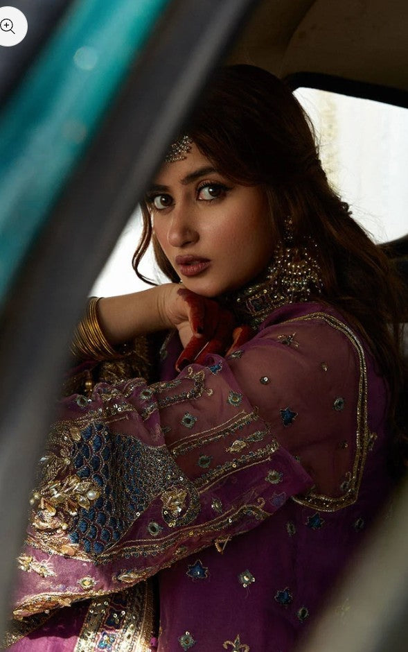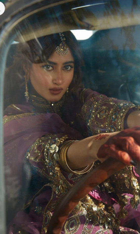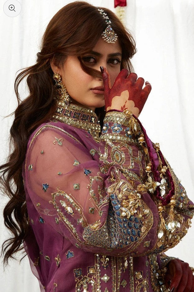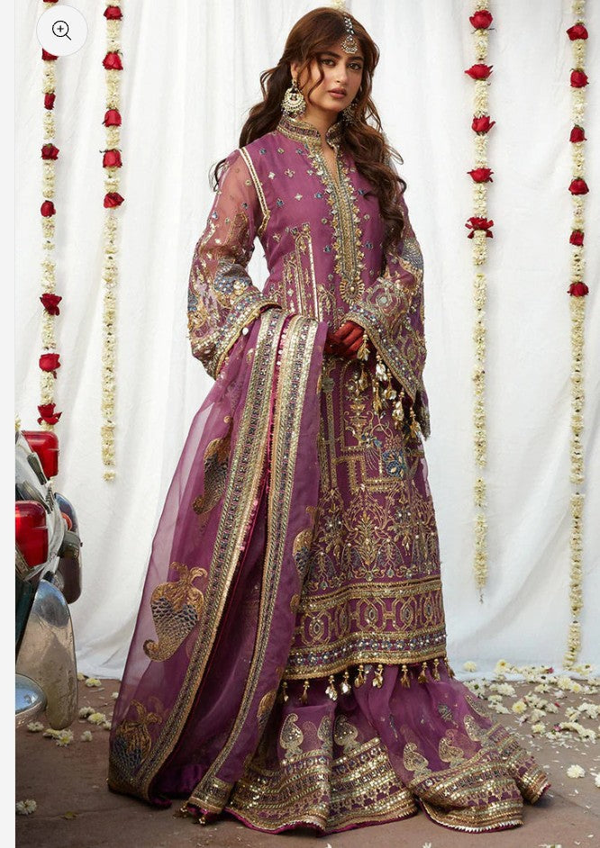 Jigri is composed over a vintage mauve base in organza. Sajal carries the delicately embroidered kameez with a composed neckline and heavy daman embroideries finished with hand embellishments. It comes with an embroidered sharara finished off with our signature borders and a tonal dupatta doused in vintage paisley pattern and framed with a delicate borders for the perfect vintage appeal.