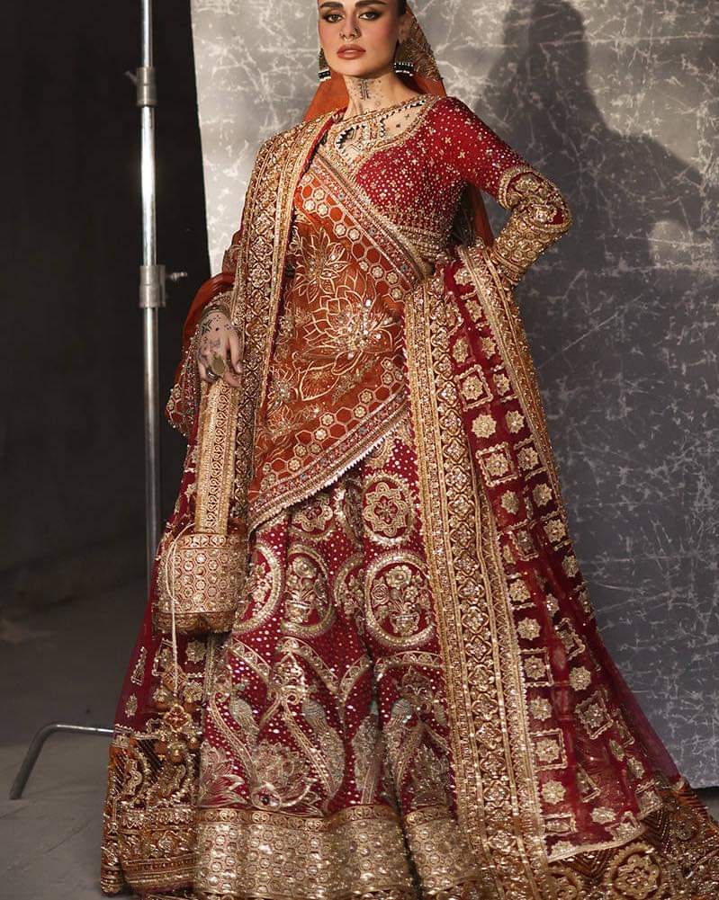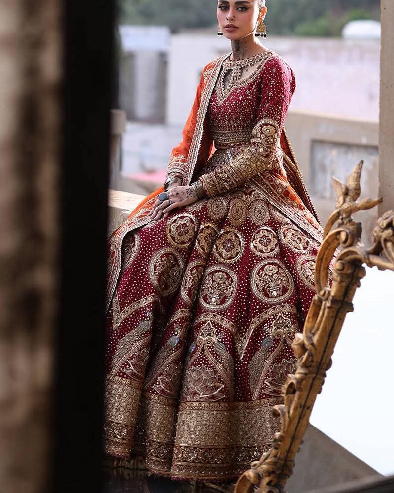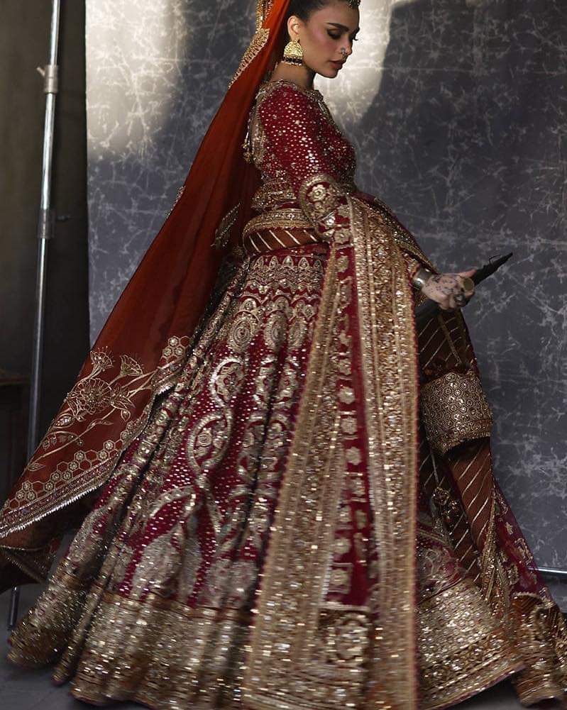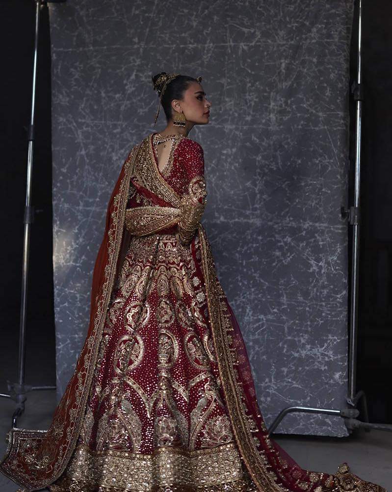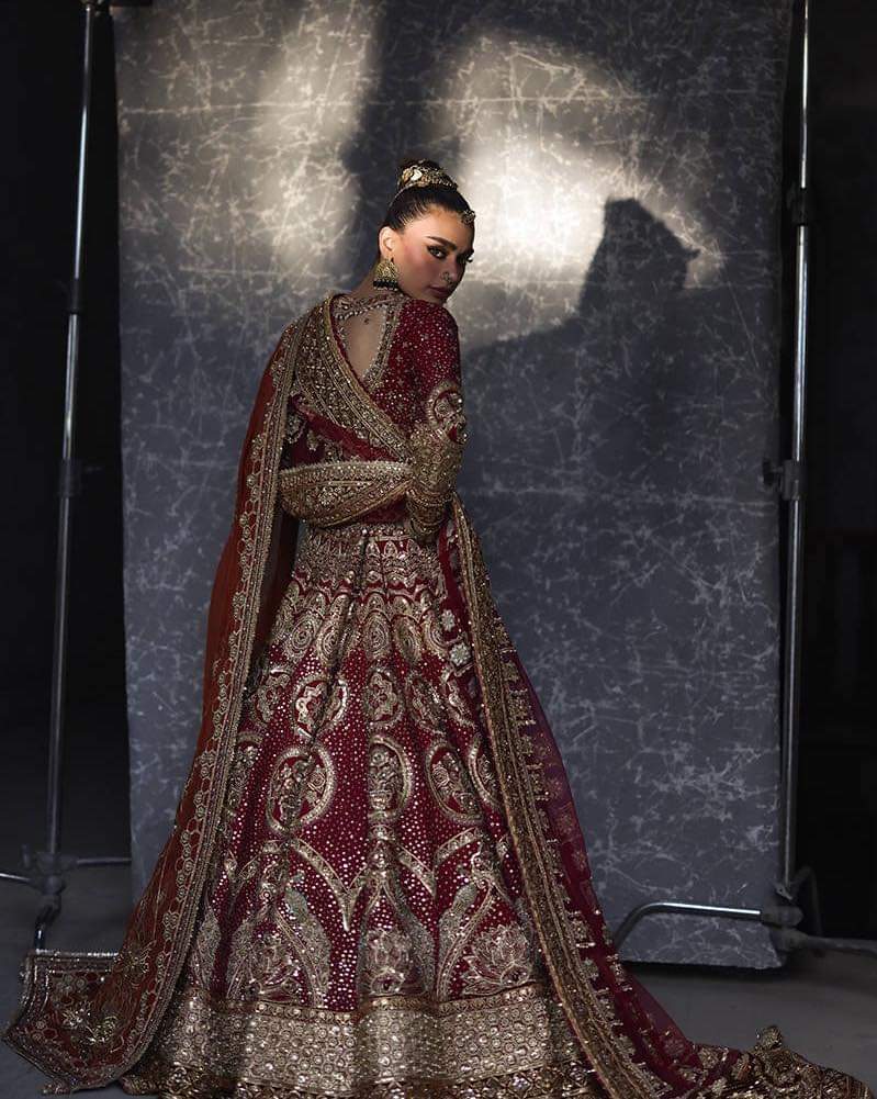 This outstanding shirt is embellished with tila, zari, dabka, naqseh, sequence, resham thread hand work to provide a welcome pop of colour and Swarovski crystals to give it the perfect sheen. To further enhance the beauty of the shirt we have added floral trellis and floral motifs. The back of this exquisite piece has booties which make it heavy and eye catching. To complement with this shirt, we have added emerald green jaamawar izaar pants in pure silk. This breath-taking shirt is paired with a magenta kataan silk dupatta embellished with booties.