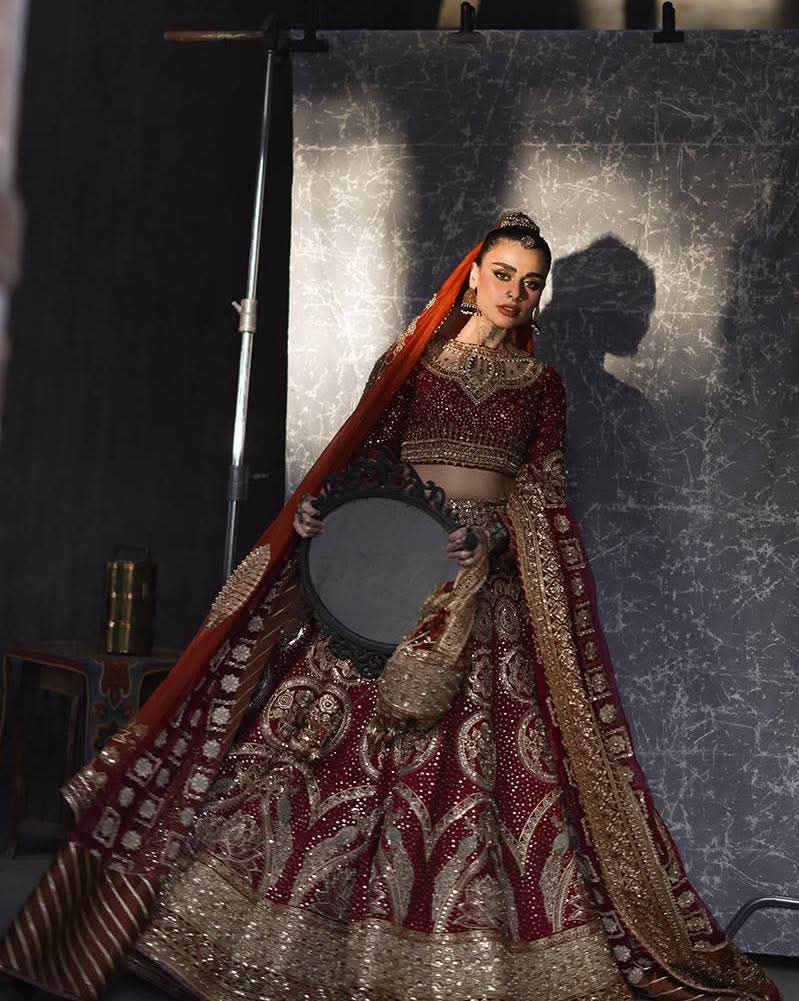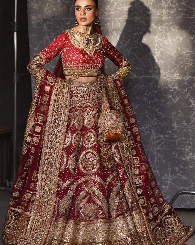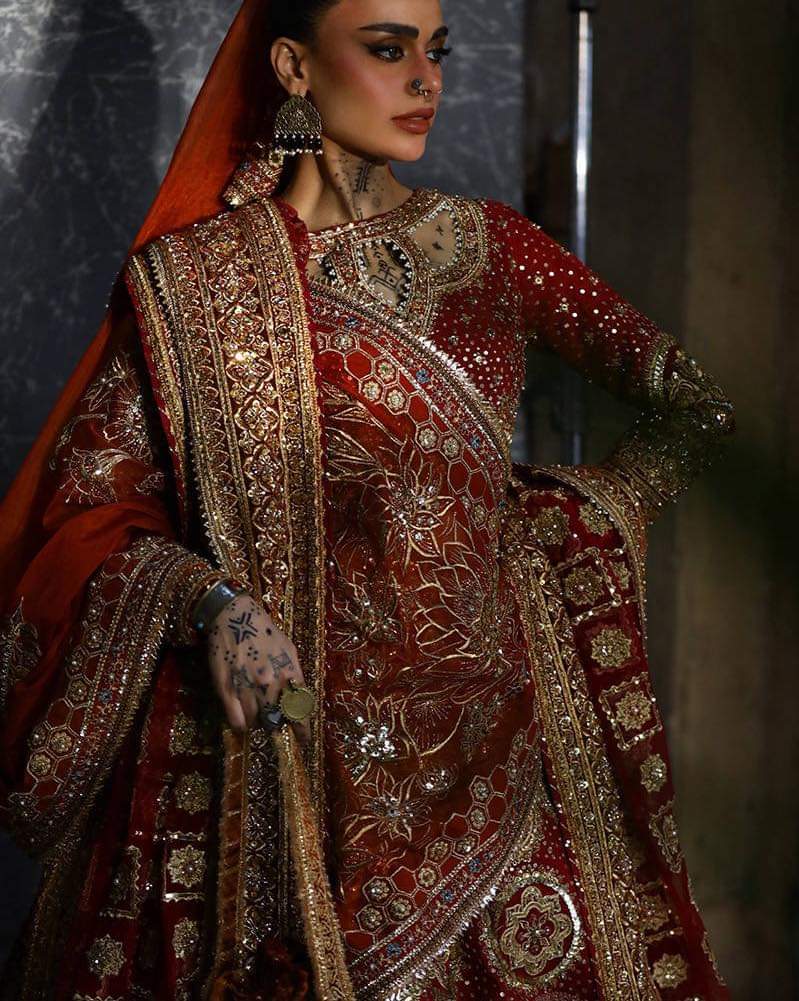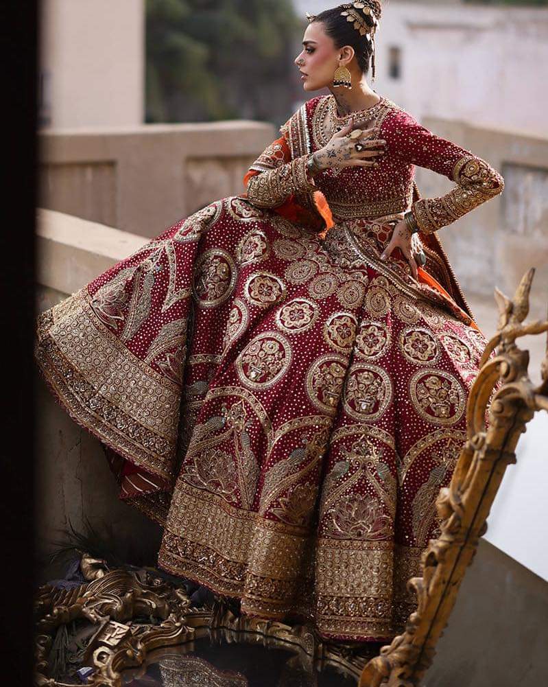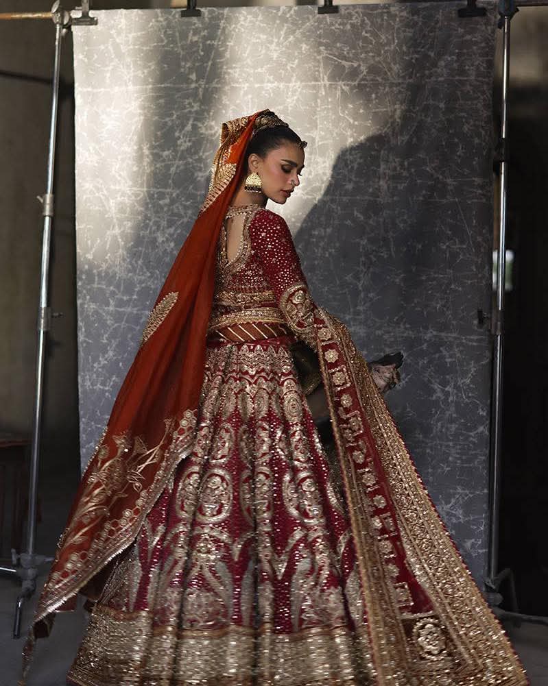 This outstanding shirt is embellished with tila, zari, dabka, naqseh, sequence, resham thread hand work to provide a welcome pop of colour and Swarovski crystals to give it the perfect sheen. To further enhance the beauty of the shirt we have added floral trellis and floral motifs. The back of this exquisite piece has booties which make it heavy and eye catching. To complement with this shirt, we have added emerald green jaamawar izaar pants in pure silk. This breath-taking shirt is paired with a magenta kataan silk dupatta embellished with booties.