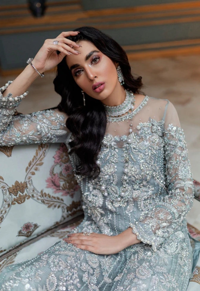 This ice blue long shirt crafted from pure silk organza is heavily ornamented with Crystal's and thread work. This luxurious outfit is finished with raw silk pants and a pearl embellished dupata for an ethereal look..
