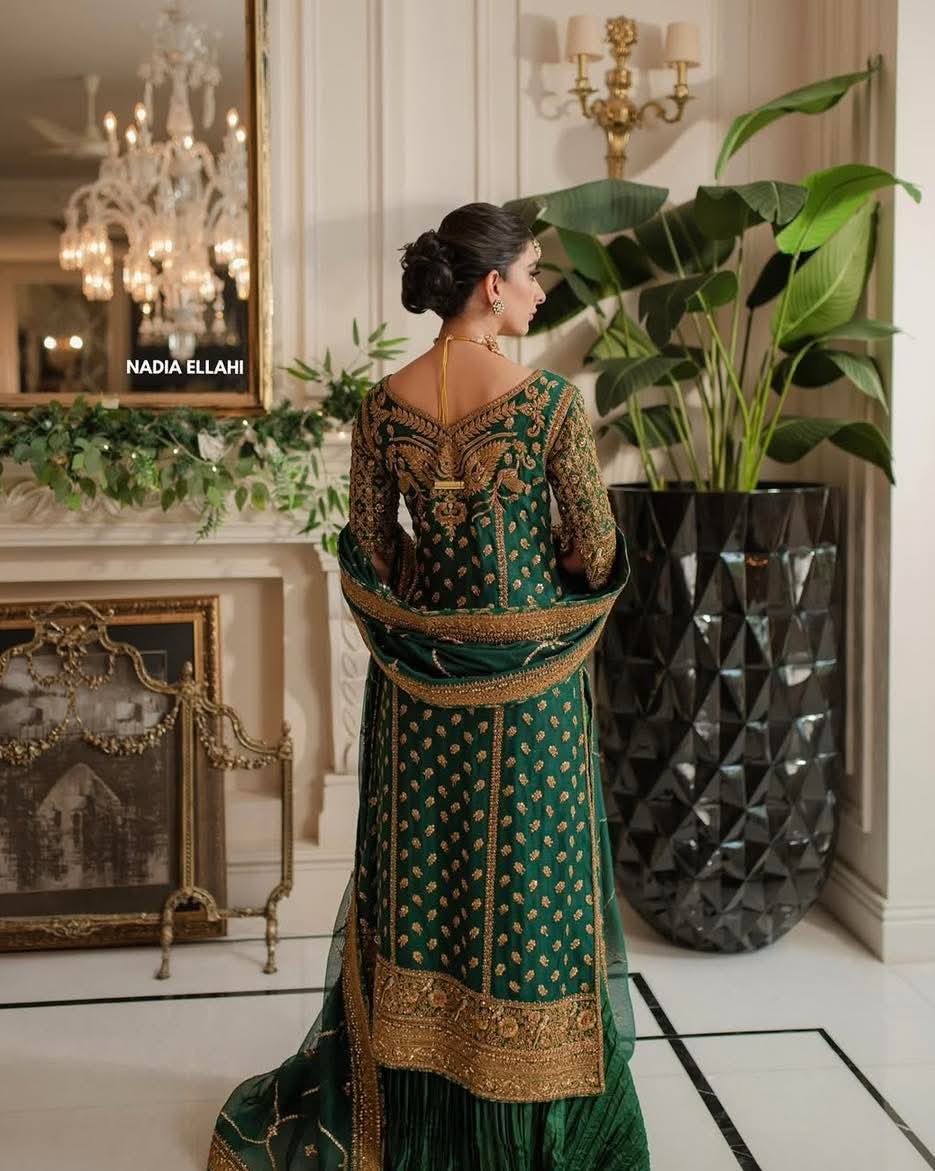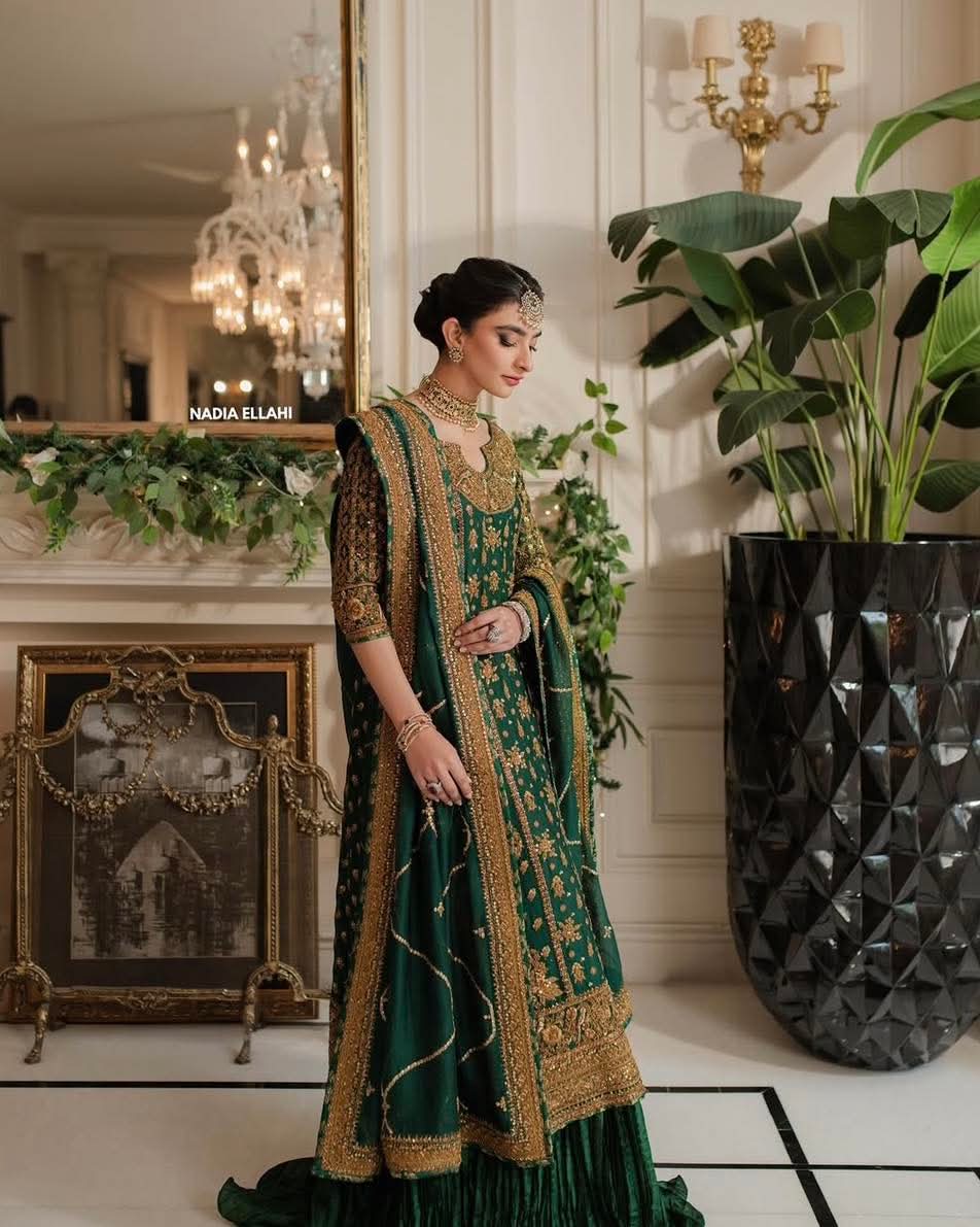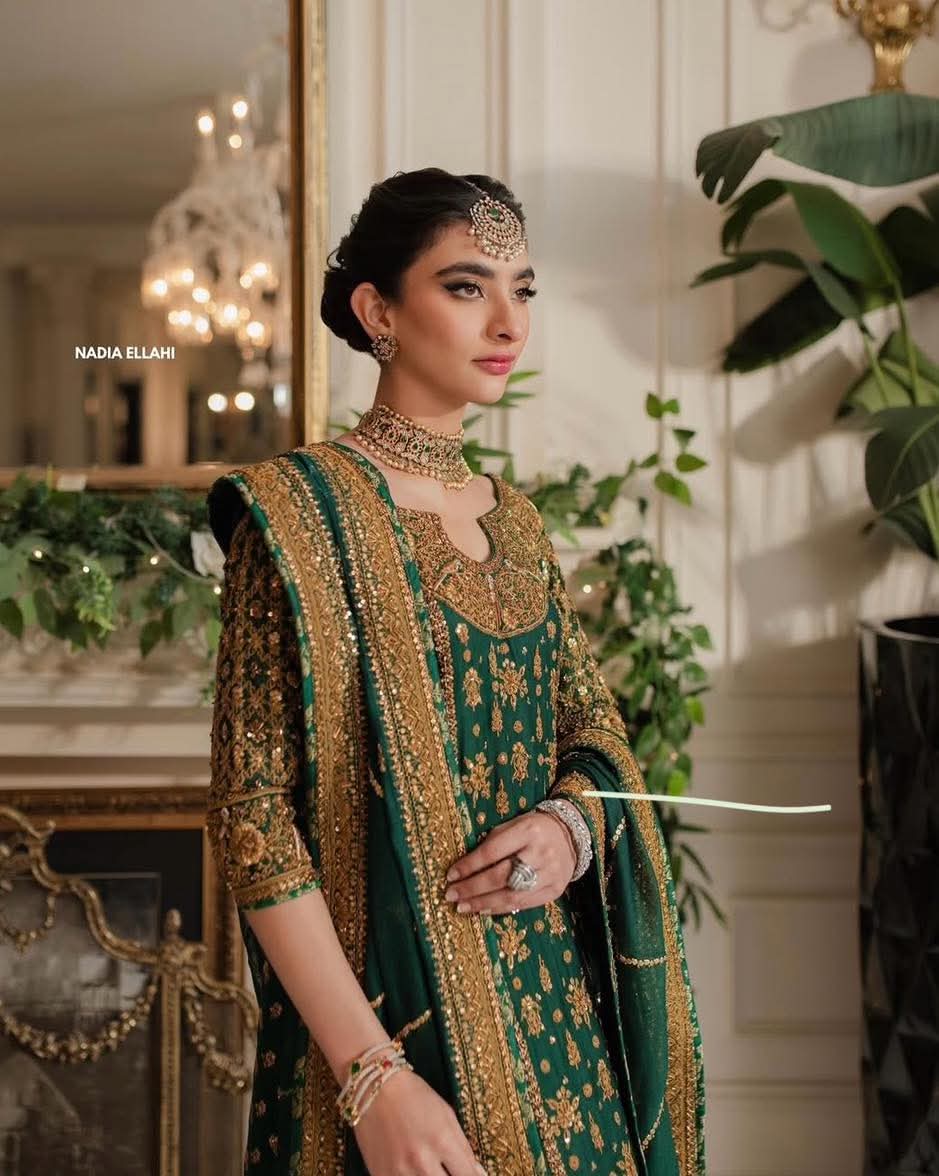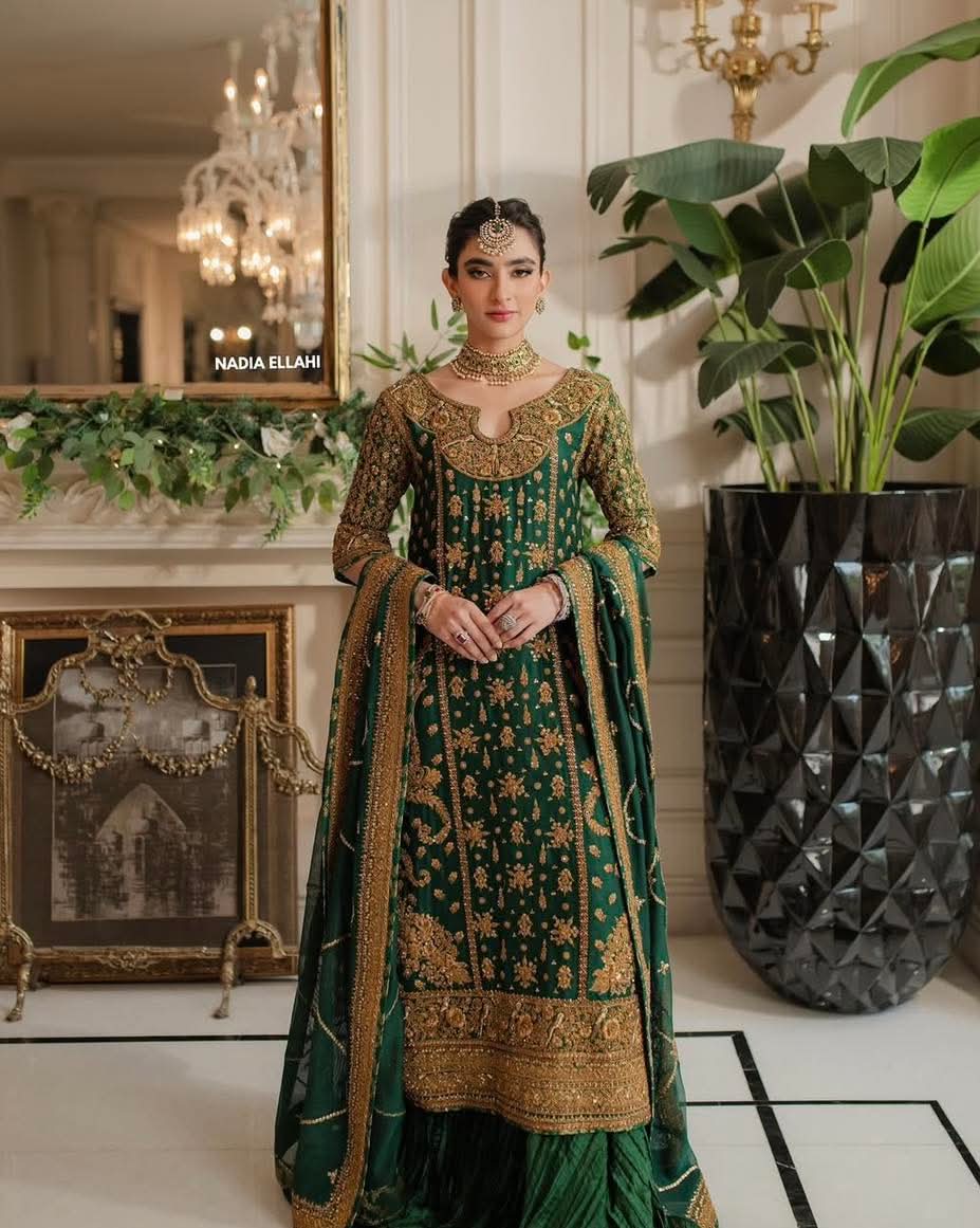 Mehrunissa by Nadia Ellahi” is an opulent ensemble that embodies regal charm and timeless sophistication. Designed with meticulous attention to detail, it features exquisite hand embroidery, intricate embellishments, and luxurious fabrics that drape gracefully. The ensemble’s rich color palette and delicate craftsmanship reflect a perfect fusion of tradition and modern elegance, making it an ideal choice for those who seek refinement and grandeur.