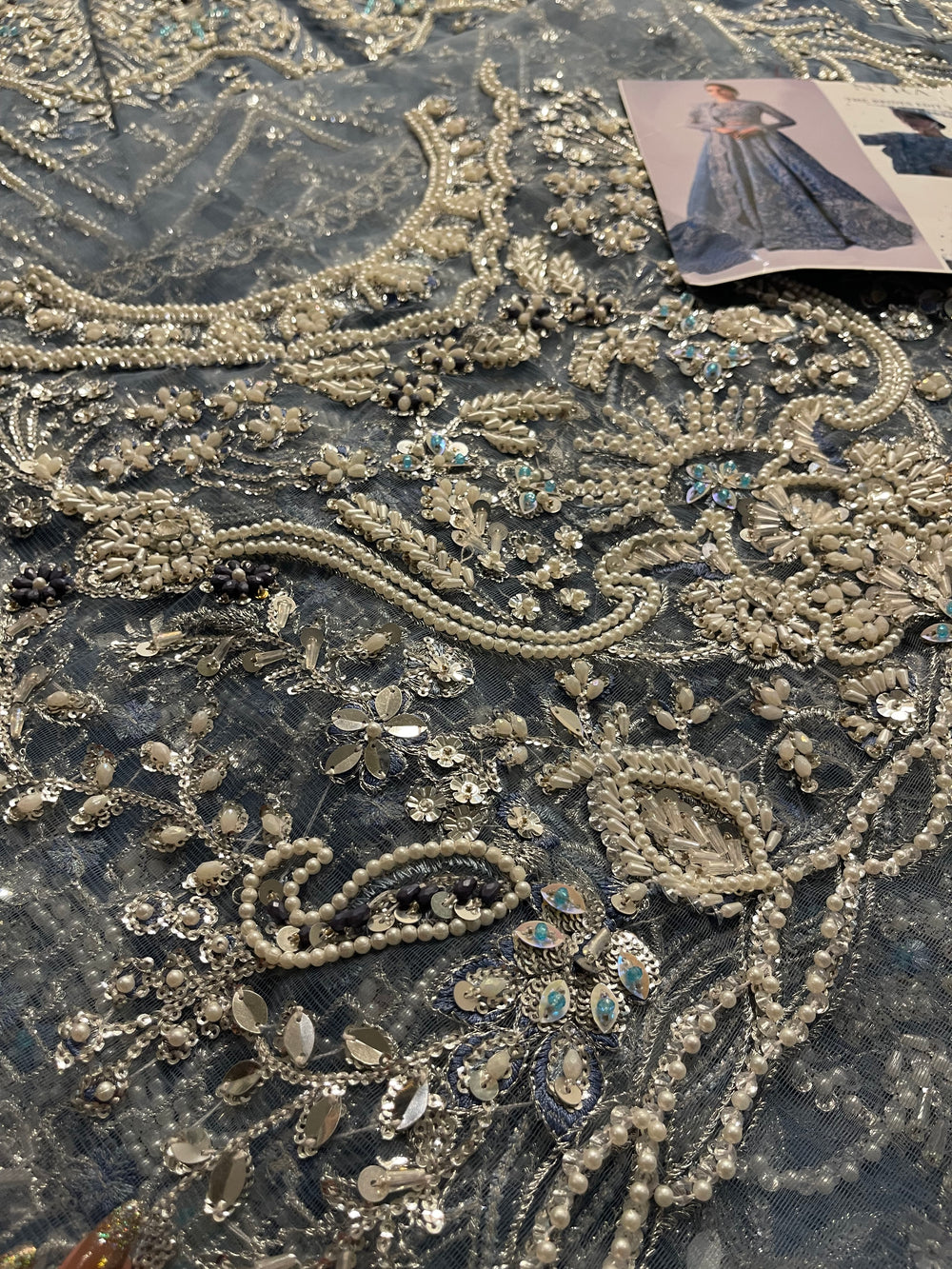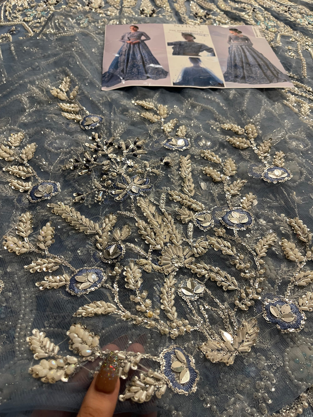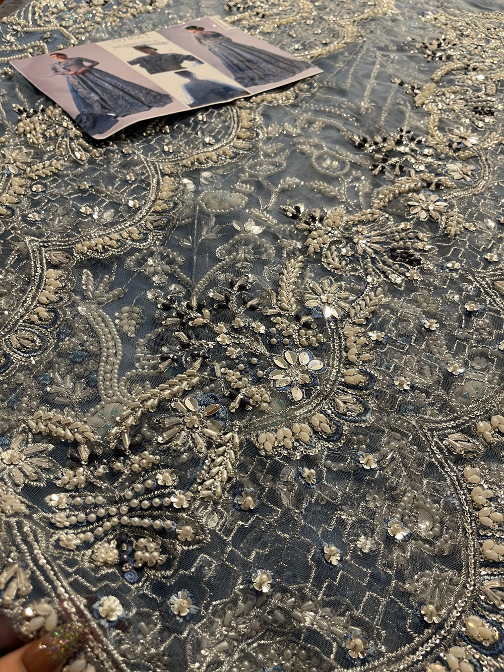 An elegant sky blue lehenga choli made on organza. This silhouette features heavy florid embroidery and a stunning work of Resham thread, naqshi, dabka, sequin, and pearls. The look is finished with a heavy net dupatta creating a dreamy look for your wedding.