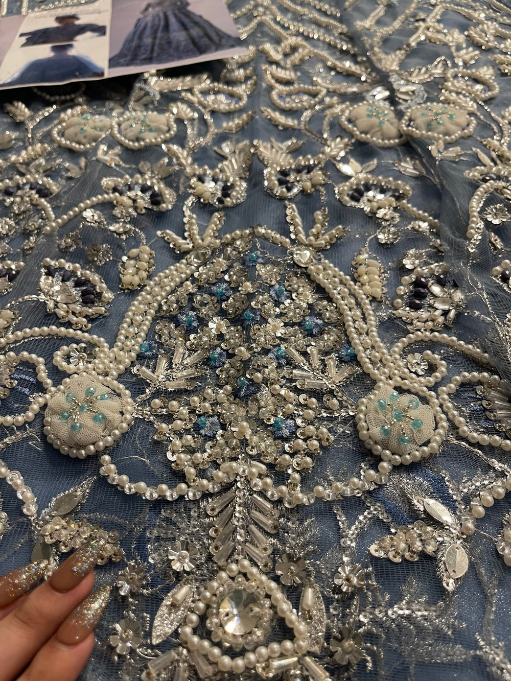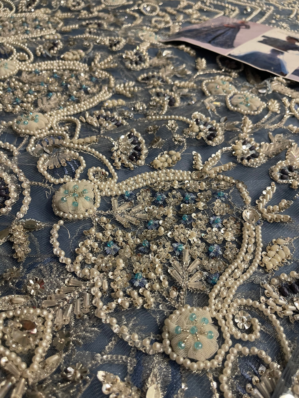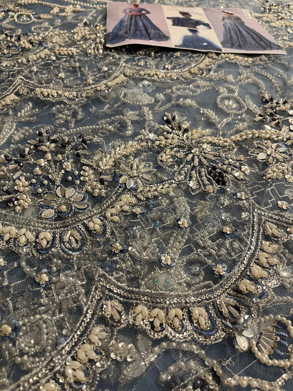 An elegant sky blue lehenga choli made on organza. This silhouette features heavy florid embroidery and a stunning work of Resham thread, naqshi, dabka, sequin, and pearls. The look is finished with a heavy net dupatta creating a dreamy look for your wedding.