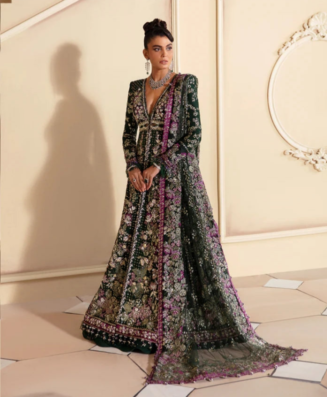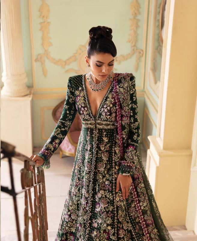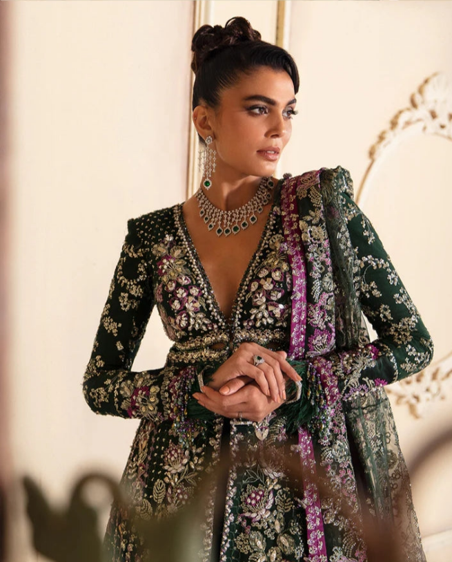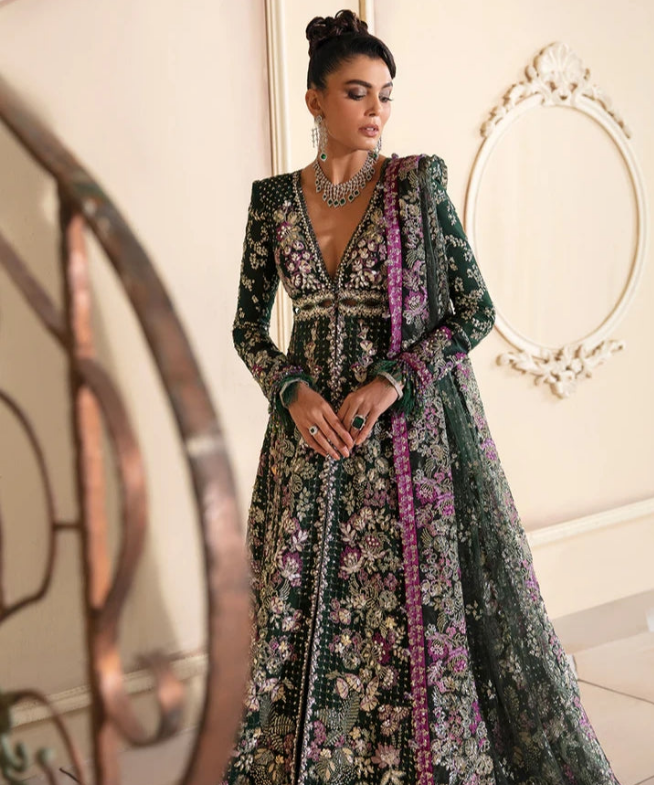 A secret garden created in the form of a forest green apparel adorned with florals of monochromatic and wine shades while the light gold sequin and tilla is etched beautifully in between. The transparent and lucent top has a blooming floral pattern while pattern runs down in panels showing the depth of a secret garden.