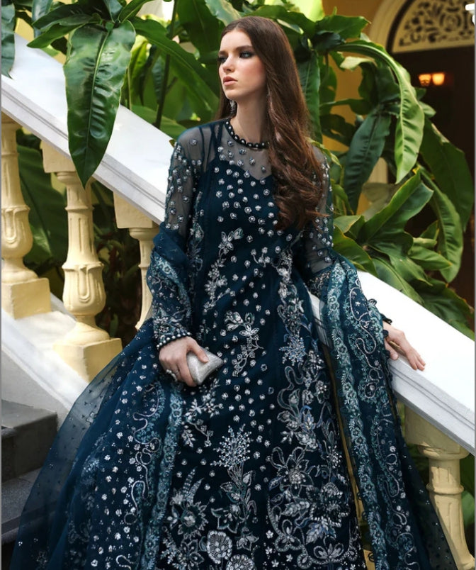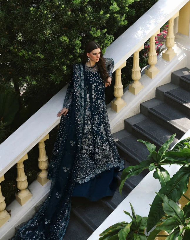 'In the deep allure of teal blue “suzumi”, this composed three-panel shirt is a showcase of elegance with a hem adorned with pell details. The crew neckline is intricately embellished with loops and pearls, leading down to an aux silk lining with a modern sweetheart neckline. Full, filigree sleeves bordered with loops and pearls enhance the garment’s luxurious appeal. The ensemble features a modern Khaka with a drop corner detailed in laser work and a jaal of florals highlighted on net, hand-embellished with stones. An organza dupatta with hand-sewn silvery floral motifs and loop details completes this majestic look.