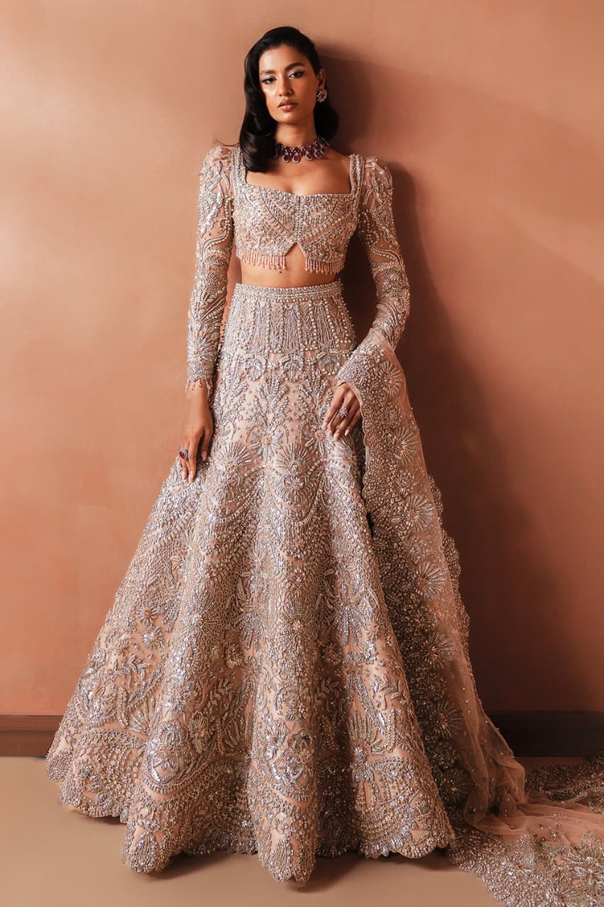 matching net dupatta, is a celebration of refined bridal artistry. Adorned with delicate handwork sparkling crystals, classic dabka, intricate katdana, and traditional mukesh, every detail is crafted to catch the light and the heart