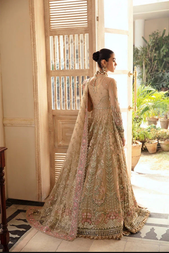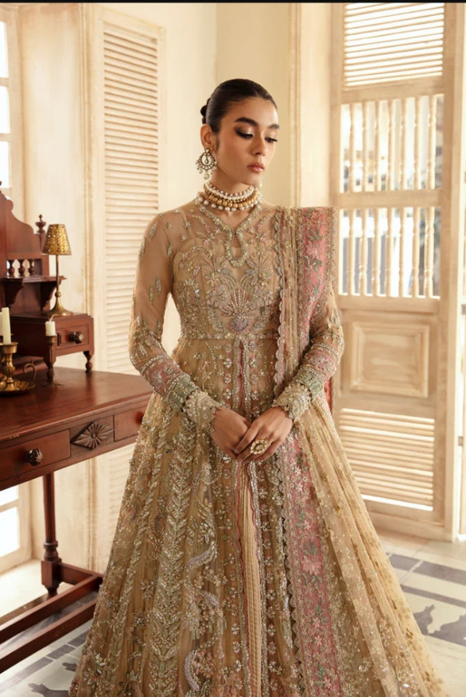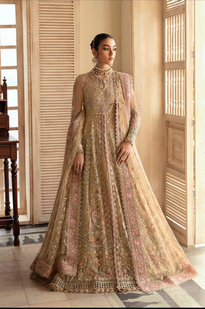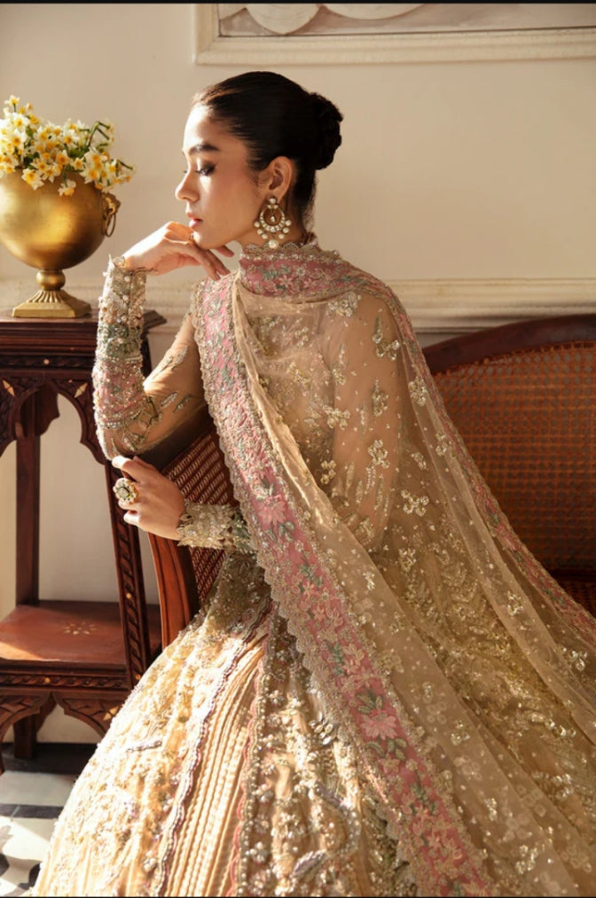 Emerges as a beacon of elegance, donning a Ravishing Dark Fuchsia gown in Organza, meticulously paired with Raw Silk, Sharara, reflects the masterpiece of hand crafted artistry. A divine touch is introduced through a delicate and rich Zari Oraganza Dupatta with motifs on the corner and sequence spray dance in jubilant harmony. Raizel’s presence will make you the center of attention, worthy of admiration and awe.