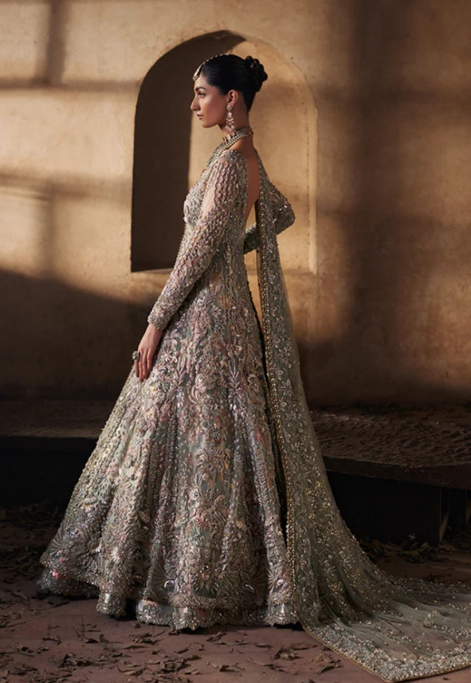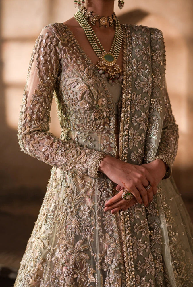 SHAYNA, a symphony of tradition and modern allure in light green. The printed lama fabric lehenga and ethereal net gown dance together, while the exquisitely handcrafted net dupatta weaves a tale of craftsmanship and refinement.Beyond attire, Shayna is a captivating ode to elegance, ensuring your journey into forever is an ever-shining masterpiece of bespoke beauty.
