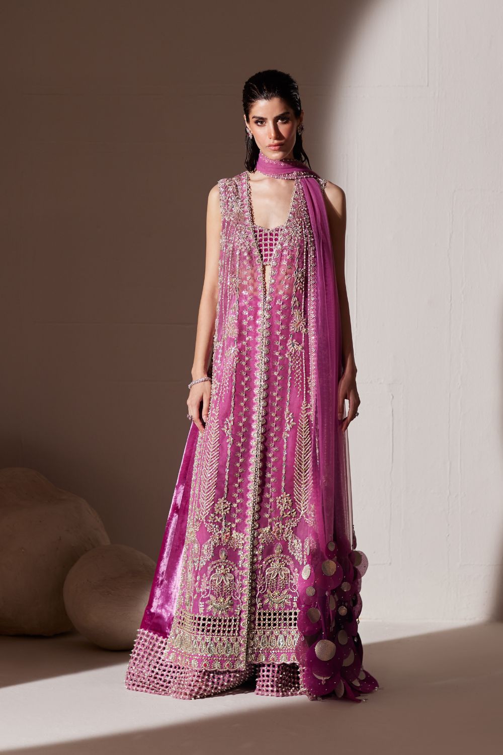 Verdant is a luxurious organza bodacious jacket with a sleek silhouette, paired with a stunning geometrically embellished velvet inner. The ensemble is completed with matching velvet pants featuring intricate geometric patterns along the hem. The matching dupatta features chic circular applique finished with beads and gems for an added touch of glamour.